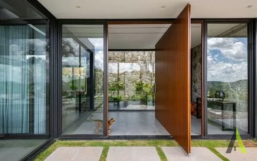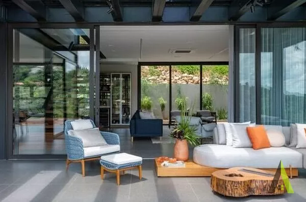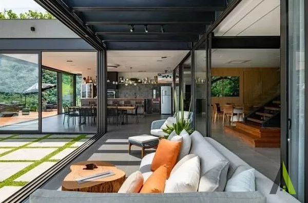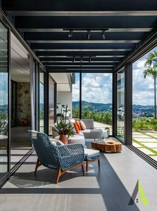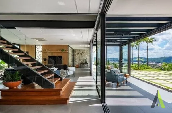 ✨A estrutura metálica foi escolhida para permitir amplos espaços aberto, sem a necessidade de pilares ou colunas intrusivas, além de ter um design contemporâneo. A transparência dos vidros maximiza a conexão com a paisagem circundante, permitindo que a luz natural inunde todos os cantos da casa.