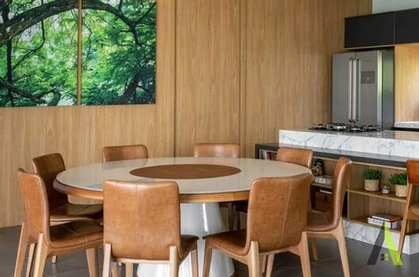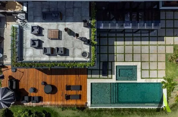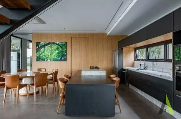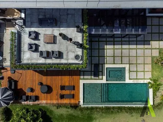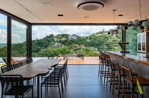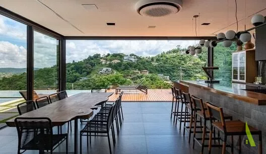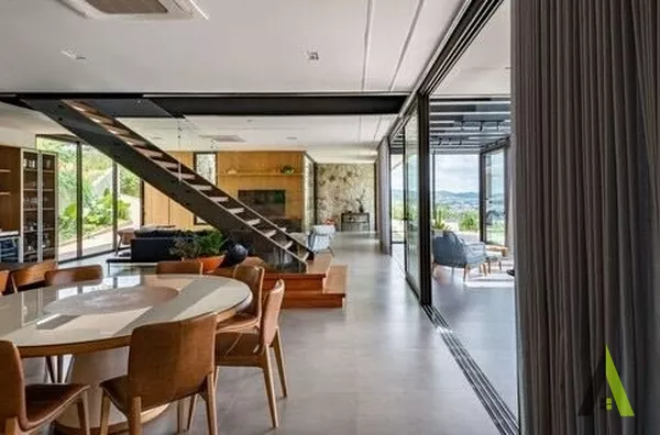 ✨A planta baixa foi projetada com foco no conforto e na fluidez dos espaços. A área social ocupa o coração da residência, com uma espaçosa sala de estar, sala de jantar e cozinha integrada, permitindo uma convivência harmoniosa entre os moradores. Grandes portas de correr conectam diretamente esses ambientes com a área de lazer externa, que conta com um deck amplo, piscina e uma paisagem exuberante. Um local perfeito para relaxar e apreciar o pôr do sol deslumbrante.