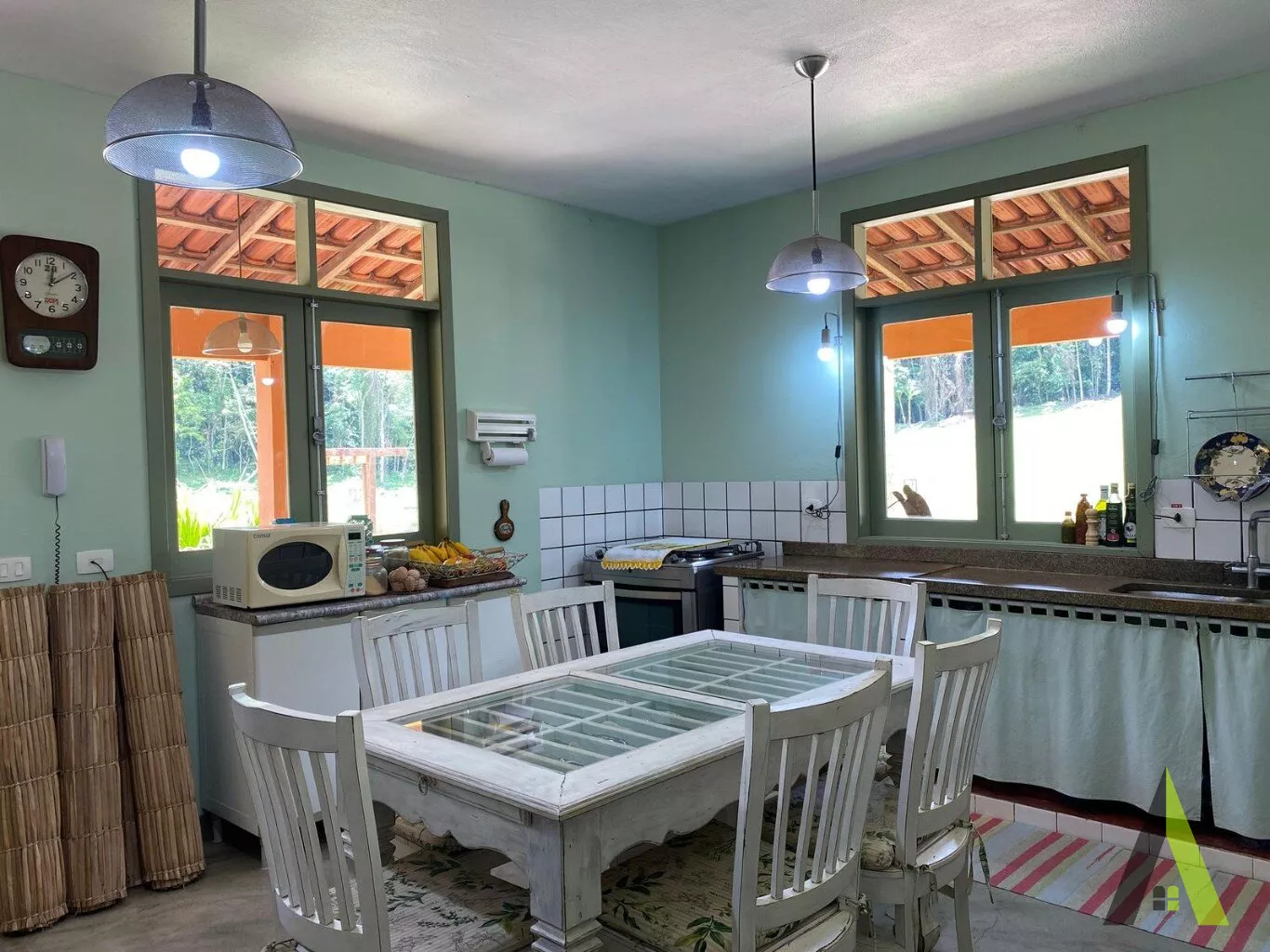 Cozinha espaçosa com fogão à lenha e sala de jantar